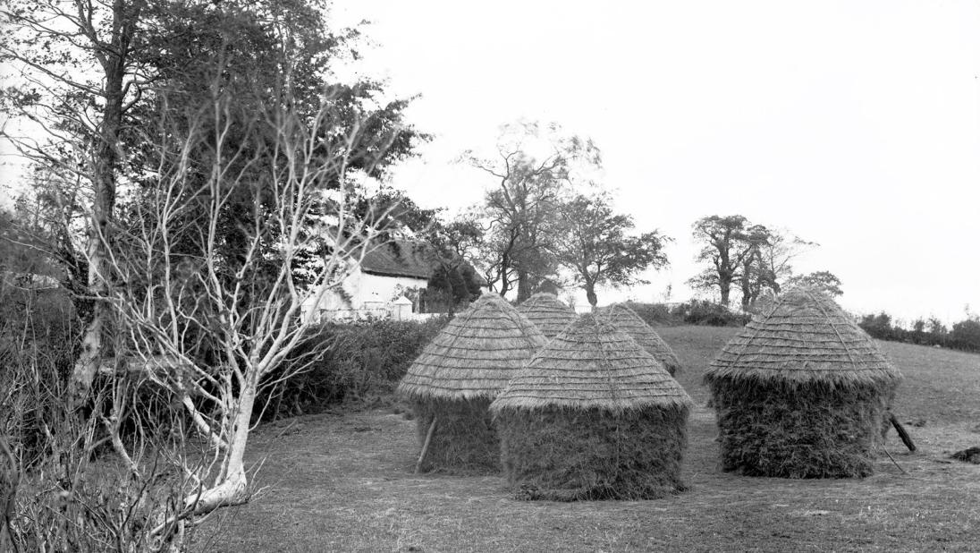 The hay was made into a stack which was built up with straight sides, or outward leaning sides, for several feet. Then the steep conical roof was formed. This was thatched with straw to make it water tight. Several days of warm dry weather was essential for haymaking. Repeated soaking with rain reduced the nutritive value of the hay, and damp hay rotted and was useless.