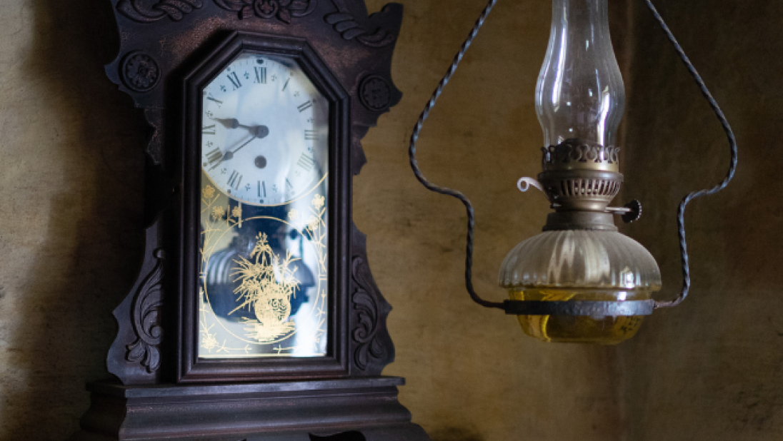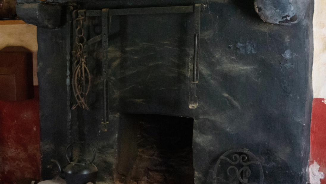 The two stone, whitewashed farmyard entrance pillars clearly mark the main way down through the farmyard and to the front (and only) door of the farmhouse. The house was heated by the open hearth in the kitchen. It was around the kitchen hearth fire that everyday household duties were performed and daily meals taken. After the day’s work, family and neighbours often gathered around the hearth to talk of local affairs and past times.